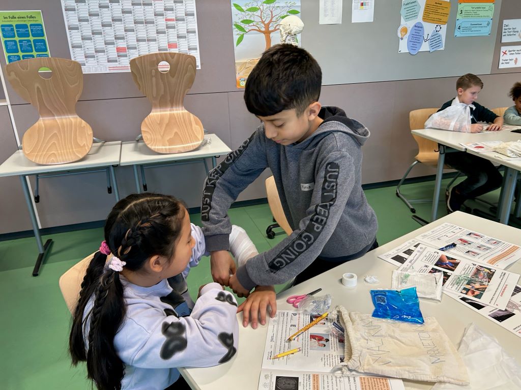 In den anschließenden drei Stunden übten die Fünftklässler anschließend das richtige Anlegen von Pflastern und verschiedenen Verbänden, das Verhalten bei Nasenbluten, wie man mit einem Sonnenbrand umgeht und welche Tiere welche Arten von Bissen oder Stichen verursachen und was man dagegen tun kann. Darüber hinaus wurde der Umgang mit Knochenbrüchen erlernt und die Bedeutung des Schutzes unseres Gehirns erarbeitet. Im letzten praktischen Teil konnten die SchülerInnen den Umgang mit Personen erlernen, die sich in einer Schocksituation befinden bewusstlos sind oder eine Herzdruckmassage benötigen. In einer anschließenden Diskussionsrunde durften die Kinder dann den anwesenden Schulsanitätern Fragen über ihre Ausbildung und ihre Einsatzgebiete stellen.