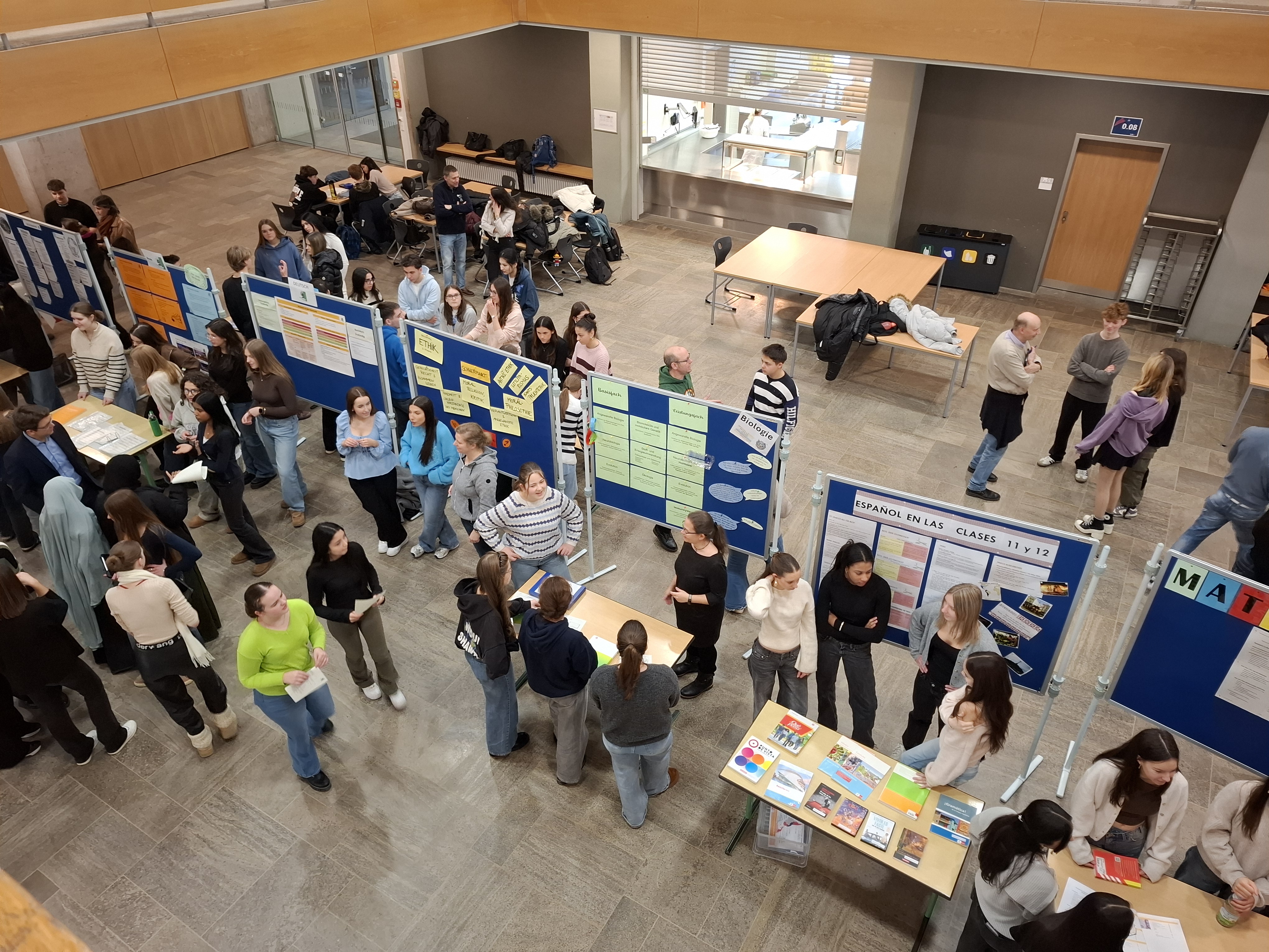Zahlreiche anschaulich und informativ gestaltete Stellwände wurden von engagierten Lehrkräften sowie Schülerinnen und Schülern der Kursstufe 1 und 2 präsentiert. In angenehmer Atmosphäre nahmen sich die Beteiligten viel Zeit, um Fragen zu beantworten und persönliche Erfahrungen weiterzugeben. So konnten Unsicherheiten abgebaut, individuelle Interessen geklärt und wertvolle Tipps rund um die Oberstufe und das Abitur vermittelt werden. Die ABI-Börse bot den Zehntklässlerinnen und Zehntklässlern damit eine hilfreiche Grundlage, um ihren weiteren schulischen Weg gut informiert und mit größerer Sicherheit zu planen.