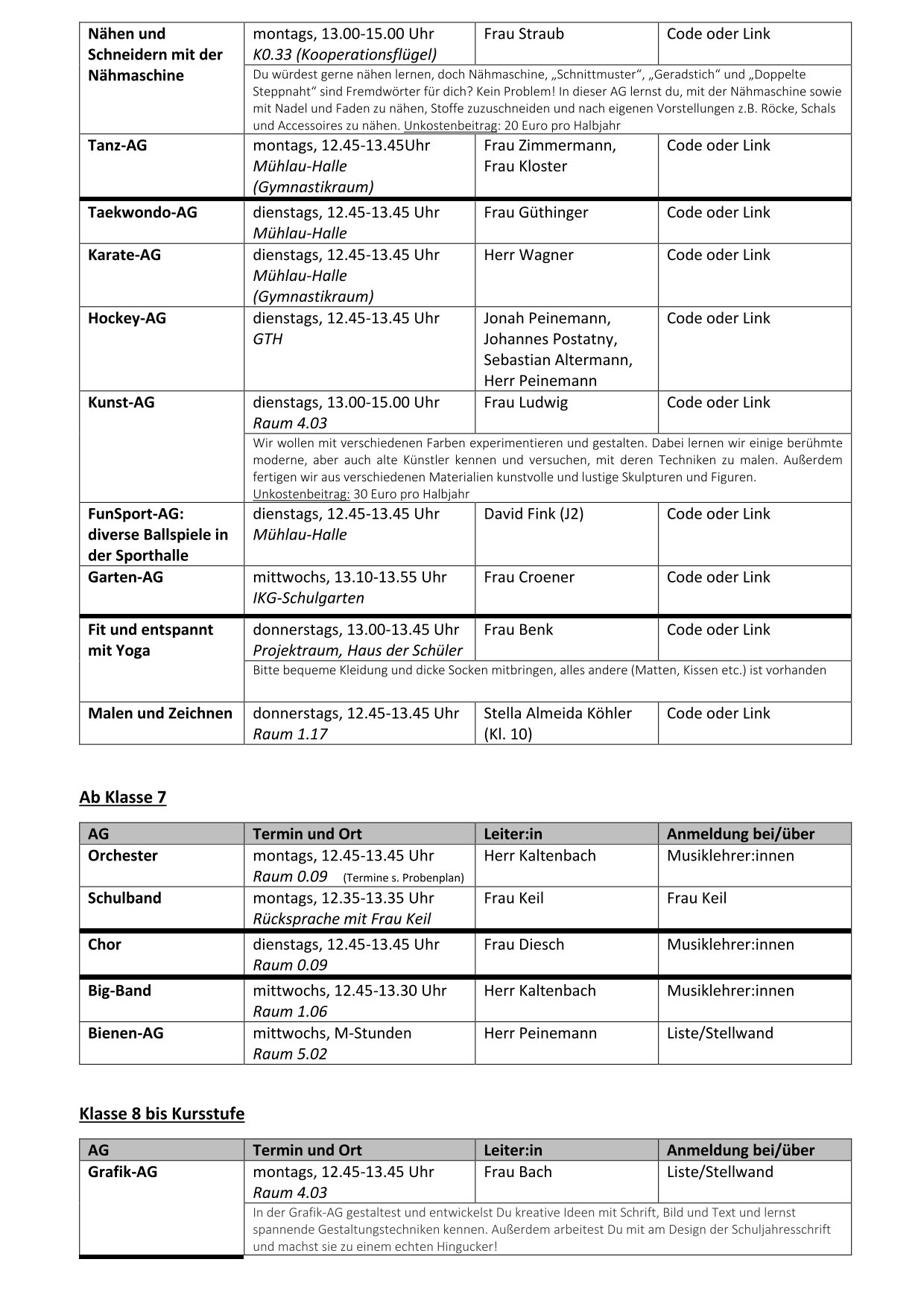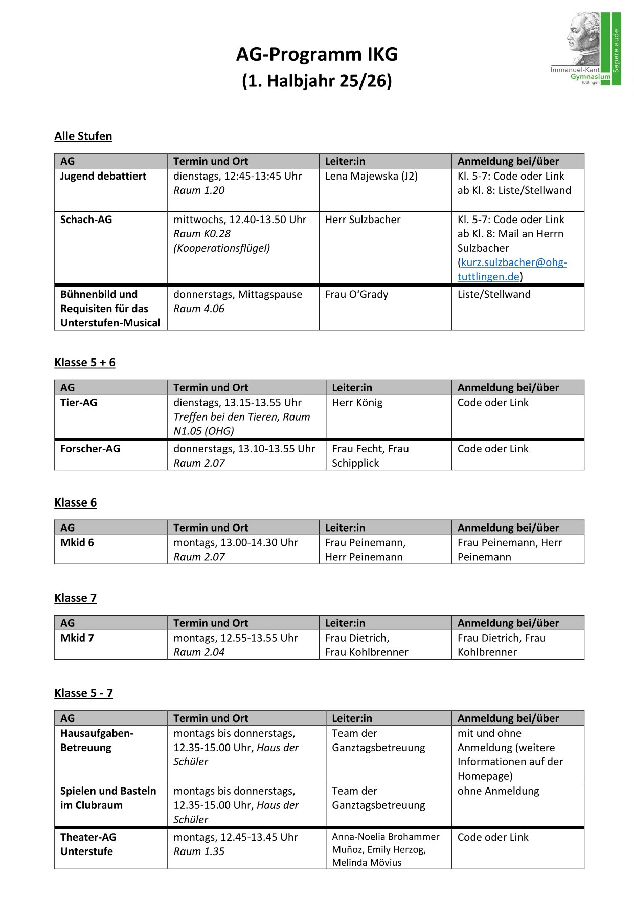 Ab sofort ist das AG-Programm für das 1. Halbjahr online. Entdeckt spannende Angebote aus Sport, Musik, Technik, Kunst und vielem mehr. Anmeldungen sind ab jetzt möglich – also sichert euch schnell euren Platz in eurer Wunsch-AG!