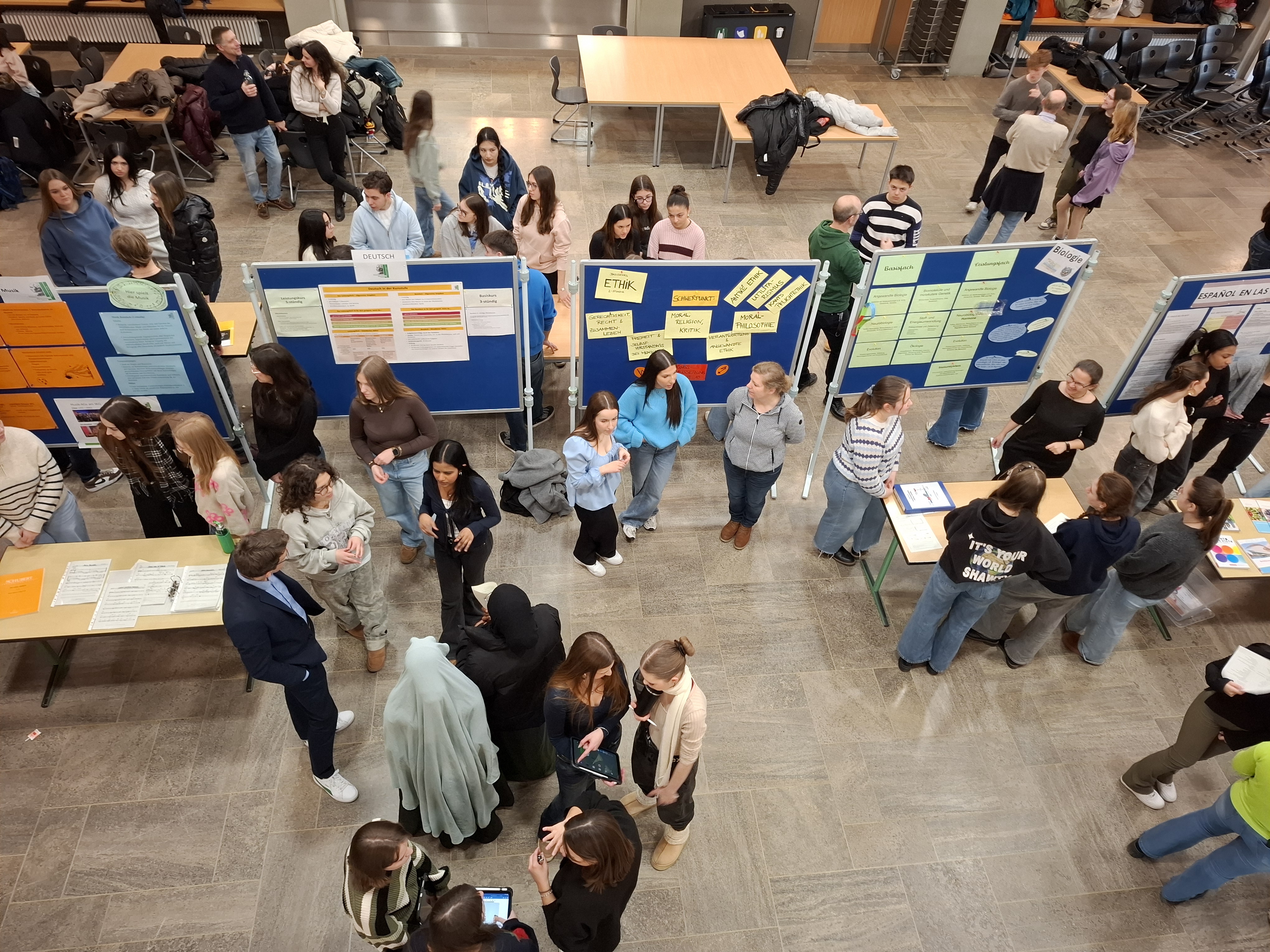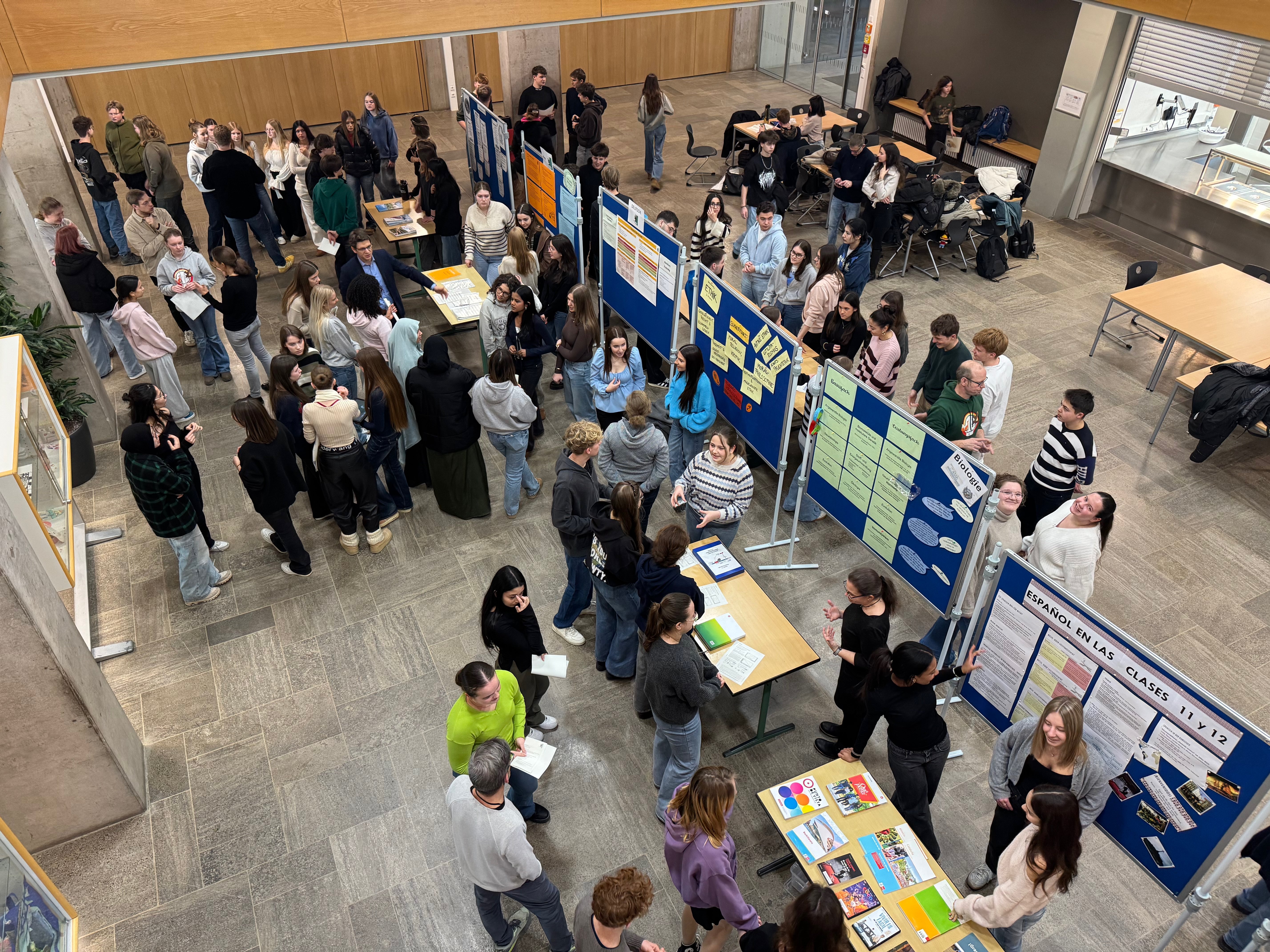 Zahlreiche anschaulich und informativ gestaltete Stellwände wurden von engagierten Lehrkräften sowie Schülerinnen und Schülern der Kursstufe 1 und 2 präsentiert. In angenehmer Atmosphäre nahmen sich die Beteiligten viel Zeit, um Fragen zu beantworten und persönliche Erfahrungen weiterzugeben. So konnten Unsicherheiten abgebaut, individuelle Interessen geklärt und wertvolle Tipps rund um die Oberstufe und das Abitur vermittelt werden. Die ABI-Börse bot den Zehntklässlerinnen und Zehntklässlern damit eine hilfreiche Grundlage, um ihren weiteren schulischen Weg gut informiert und mit größerer Sicherheit zu planen.