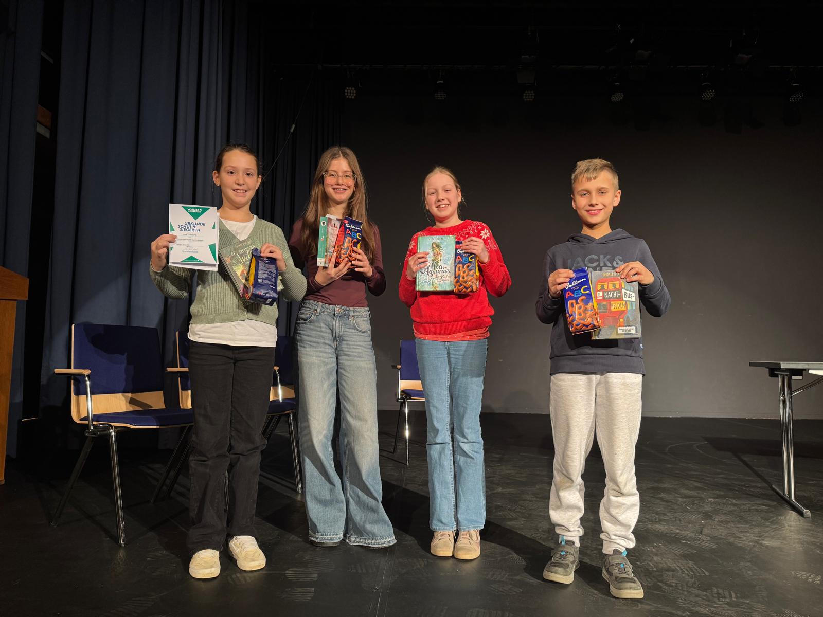 Mit ausdrucksstarker Stimme und sicherem Gespür für Stimmung und Tempo lasen Lukas Skolny (6a), Ines Thierjung (6b), Helena Bartknecht (6c) und Stella Caliebe (6d) aus ihren Lieblingsbüchern, darunter „Nachtbushelden“ von Onjali Q. Raúf, „Ein Mädchen namens Willow“ von Sabine Bohlmann, „Alea Aquarius“ von Tanya Stewner und „Ein pfirsichsüßer Mord“ von Joanne Fluke. Die Jury hatte keine leichte Aufgabe, denn alle Vorträge überzeugten durch große Lesefreude und Engagement.